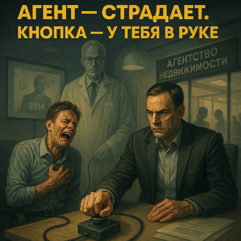 ⚡️ Эксперимент Милгрэма каждый день. Только теперь в агентствах недвижимости Если ты руководишь агентами — остановись на минуту. Реально. Прочитай внимательно. Ты наверняка слышал об эксперименте Милгрэма. Если нет — вот, просвещайся: Эксперимент Милгрэма Коротко: «Учитель» (испытуемый) наказывает «ученика» (актёра) ударами тока за неправильные ответы. Ток усиливается. Ученик орёт. Просит остановиться. Учитель паникует. Но рядом стоит человек в халате — авторитет. И говорит: «Продолжайте. Всё под контролем. Я беру ответственность на себя». Большинство людей нажимают кнопку до конца. До уровня смертельного разряда. Потому что им сказали, что так надо. Потому что авторитет сказал. А теперь перенеси это на рынок недвижимости 👇 👤 Ученик = агент. Настоящий. Не актёр. Живой человек. С реальными страхами и выгоранием. 🧑🏫 Учитель = ты. РОП — Руководитель Отдела Продаж. Директор. Руководитель. 🧪 Человек в халате = бизнес-тренер. Старичок из соседнего офиса. Или ты сам 10 лет назад.