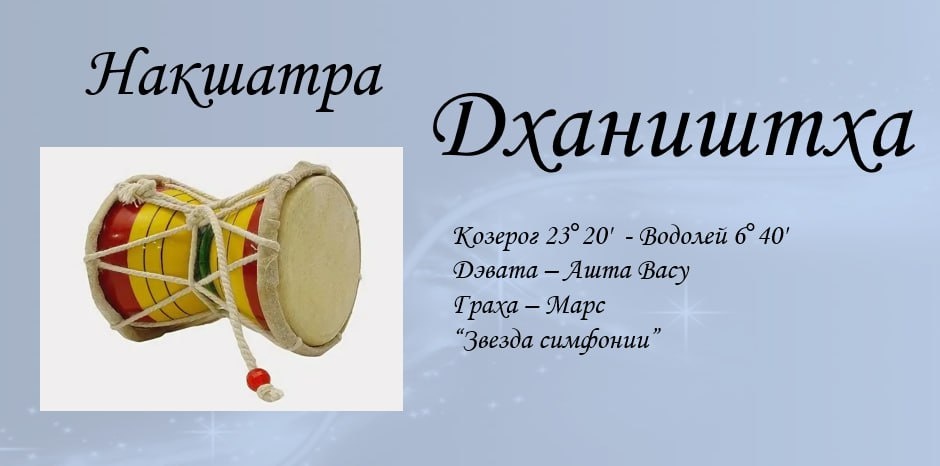 Планеты в Дхаништхе🥁 🌟Напоминаю, что шакти Дхаништхи – давать славу и изобилие, поэтому хорошо расположенные в ней планеты будут работать в этом направлении. Особенно это касается планет, связанных с процветанием и богатством, таких как Юпитер, Венера, Луна, Меркурий. Луна с Юпитером дадут славу, Венера и Юпитер – богатство, Луна и Венера – красоту, Меркурий, Венера и Луна – художественные и артистические таланты. Солнце при хороших условиях (бхава, положение диспозиторов, аспекты) даст лидерство, власть, независимость, Марс – храбрость, активность, стремление к успеху, воинские и спортивные таланты. Сатурн даст дисциплину, ответственность и терпение, также необходимые для достижения славы и богатства. Если же планеты поражены в этой накшатре, то это может указывать на неспособность использовать свои ресурсы и таланты. Особенно это касается Сатурна или Кету, которые могут дать неуверенность в себе и склонность к самокритике. Раху хорошо чувствует себя в этой Накшатре, стремление к б