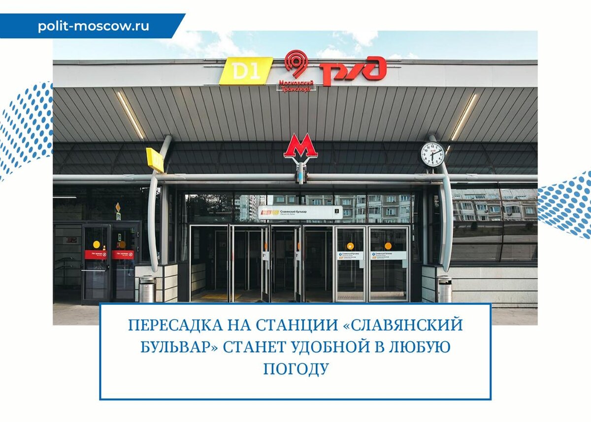 🐎Пересадка на станции «Славянский бульвар» станет удобной в любую погоду 🏛На московском городском вокзале Славянский Бульвар устанавливают навесы. 📝«Это один из самых востребованных и важных пересадочных узлов для жителей Москвы и Подмосковья. Ежедневно здесь совершается больше 100 тысяч поездок, запущен 21 наземный маршрут. Особое влияние на популярность хаба оказала открытая в 2020 году станция МЦД. Сейчас при пересадке с диаметра и метро на наземный транспорт пассажирам приходится идти под открытым небом. Навес есть только над платформой МЦД-1», — написал Мэр Москвы. ⭐️Новые навесы, установленные по принципу «сухие ноги», сделают переходное пространство единым. Их общая площадь — около девяти тысяч квадратных метров. Конструкции накроют участки прохода к вестибюлю станции метро «Славянский бульвар» (выходу № 4), Староможайскому шоссе, Славянскому бульвару, а также к Кутузовскому проспекту» (два навеса). ✅Под ними разместят навигационные пилоны с табло прибытия, скамейки и урн