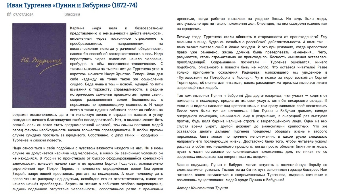 Иван Тургенев «Пунин и Бабурин» Критика