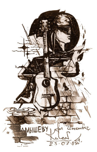 «…Письмо ваше было встречено в массах с горячим сочувствием. Мы бы очень удивились, если бы у тебя сразу завязалась с комбатом крепкая дружба, скреплённая жидкой конвертируемой валютой. Ты – есть Мышев и Мышевым останешься, другими словами воевал, воюешь и будешь воевать с собой, комбатом, замполитом вместе взятыми. «Хандра»… это не только твоя песня, но и твоё нормальное состояние. Ну, да ладно. Ты лучше скажи, как у тебя с песнями? Небось некогда стало писать? Я к чему клоню. Мы тебе до Нового года вышлем кассету. Если тебе не сложно запиши. Одну сторону напиши старых песен («Хандра», «Вольная», «Бьётся в окна летний дождь», «Череповецкая» и т.д.), а вторую новыми («Не пей, Валерка…», «Лагеря»), короче, подробные инструкции получишь вместе с кассетой, но в принципе можешь записать что захочешь. С записью не торопим. Как достанешь аппаратуру сразу садись за дело. Обратно получить кассету желательно к 25 февраля 1991г. от рождества Христова, но можно и к другой знаменательной дате – 16 марта (2 года, как нас с «Мекусом» выгнали). Вчера (13 ноября) отмечали день ОсНаза. Да, забыл написать, что живём мы в общаге вместе с «Геником», он как из войск вернулся, так мы и объединились вместе. Так вот «Геник», тоже мне Штирлиц, после 3 бутылки упал и до утра больше не поднимался. Я держался до последнего, будто на моих плечах держалась вся разведка мира, правда отличился всё-таки в другом. Но об этом хватит, слишком много самокритики. Давай-ка лучше займёмся тобой. Вот ты пишешь, что письмо моё с рисунками было тебе не понятно, и что ты его долго пытался расшифровать. Эх, ты! А ведь моё прошедшее письмо было насквозь пронизано христианской символикой. Понимаешь, я тебе, как художник – художнику, да, что там… Я, как Тарковский. Я попытался красной нитью протащить через своё письмо извечную борьбу добра и зла, там даже был лечебно-профилактический катарсис. Ведь это жизнь. Практически. Теперь вести со стран и континентов. Бюргер, по кличке «Модик», прислал письмо. Мы ему 2 письма + открытка к празднику + открытка к дню рождения, а он нам одно письмо. Каково? Бюргер, одним словом. Пишет, что был на сборах, летает как дух. Целыми днями на службе, то патруль, то наряд, то старшим машины. Стихи прислал. Хорошие. В общаге он «за маму» или «за Фиксу», короче хавчик на нём. А вот весточка с далёкого острова Свободы, зажатого в тиски империалистическими оккупантами, Литвой, Ригой, т.е. Латвией и Эстонией. Имя этому свободному, но голодному островку – Калининград, а весточку прислал стало быть «Юркен». Ничего так себе письмишко, позитивное. Всё по полочкам, всё по-хозяйски экономно, ничего не упущено. Да. Позитивно получилось. Да. Очень. У них квартира. Ну, очень большая. Естественно «Юркеном» уже проведён ремонтик и по его словам неплохая конурка получилась. A his wive, другими словами вторая половина «Юркена», повесила в проходы и на стенки солому, икебана называется. «Юркен» поворчал-поворчал и успокоился. Сейчас по командировкам летает, объездил весь за рубеж (Литву, Латвию), а в данное время где-то у чёрта на куличках строит базу для выводимых из Германии войск. Причём don’t скулит и don’t жалуется, всем очень доволен. Уходить не собирается. «Юркен» сообщил, что «Цо» комиссовался и сейчас он подымает на ноги электронную промышленность Армении. О «Мамае» уже писали. Но на всякий случай повторюсь. 