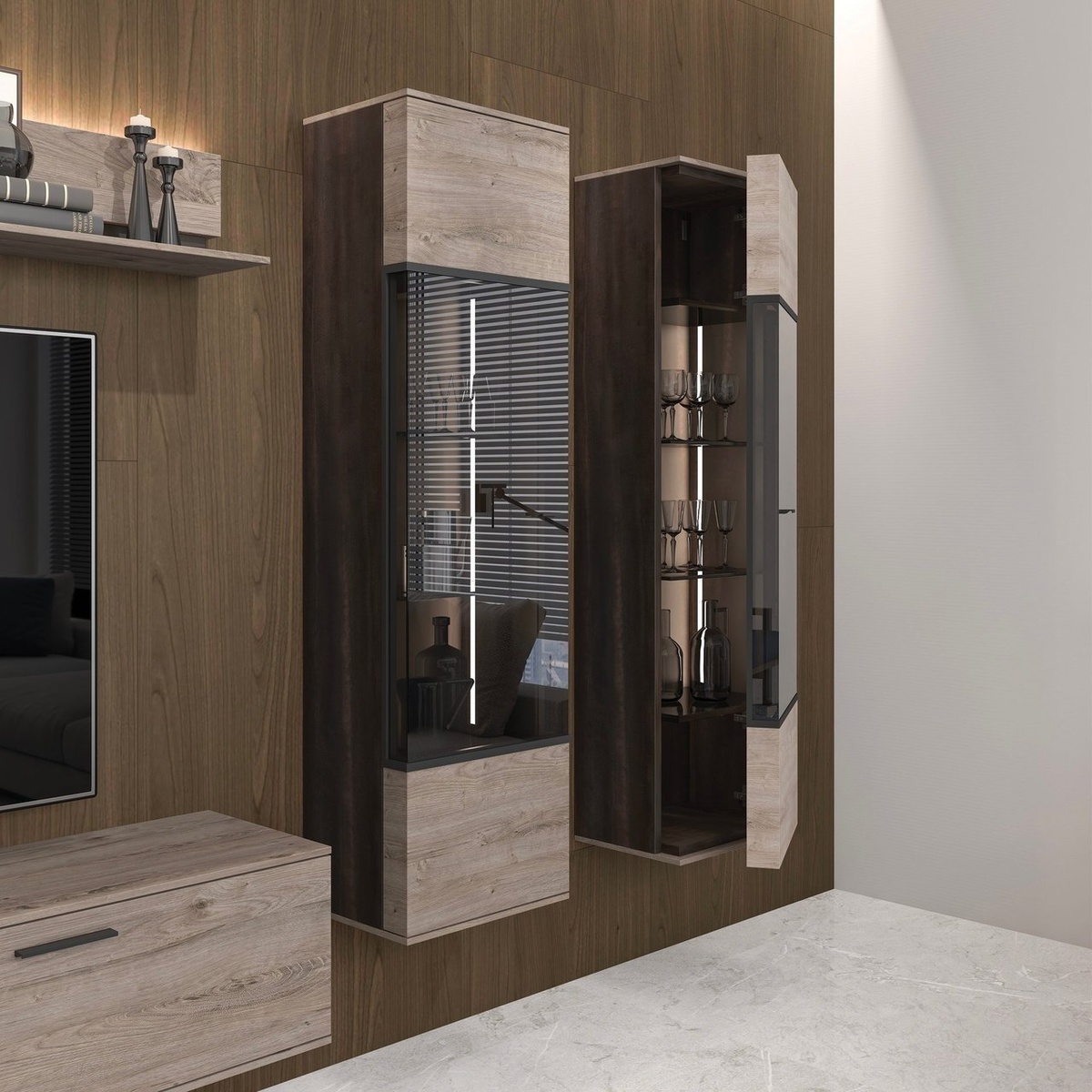 Как в элитном бутике, но у вас дома! Шкафы с дизайнерской подсветкой и сложной Г- или П-образной геометрией стекла (охватывающего не только фасад, но и торцы!) – фирменный почерк роскошных европейских брендов. Такое решение – больше, чем тренд, это знак вкуса. Оно создает гипнотическую игру бликов и гарантированно становится центром всеобщего восхищения!