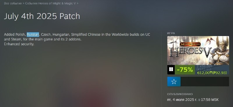 Внезапный подгон для фанатов — Heroes 5 в Steam теперь с полноценным русским языком! Перевели всё: основную игру и все допы. Плюс сейчас на них ещё и скидка — всего 93 рубля за классику. Апгрейдим ностальгию! store.steampowered.com/app/15170 Подробнее: https://hard-tm.su/threads/100329/ 🕹HARD-TM — Подписаться