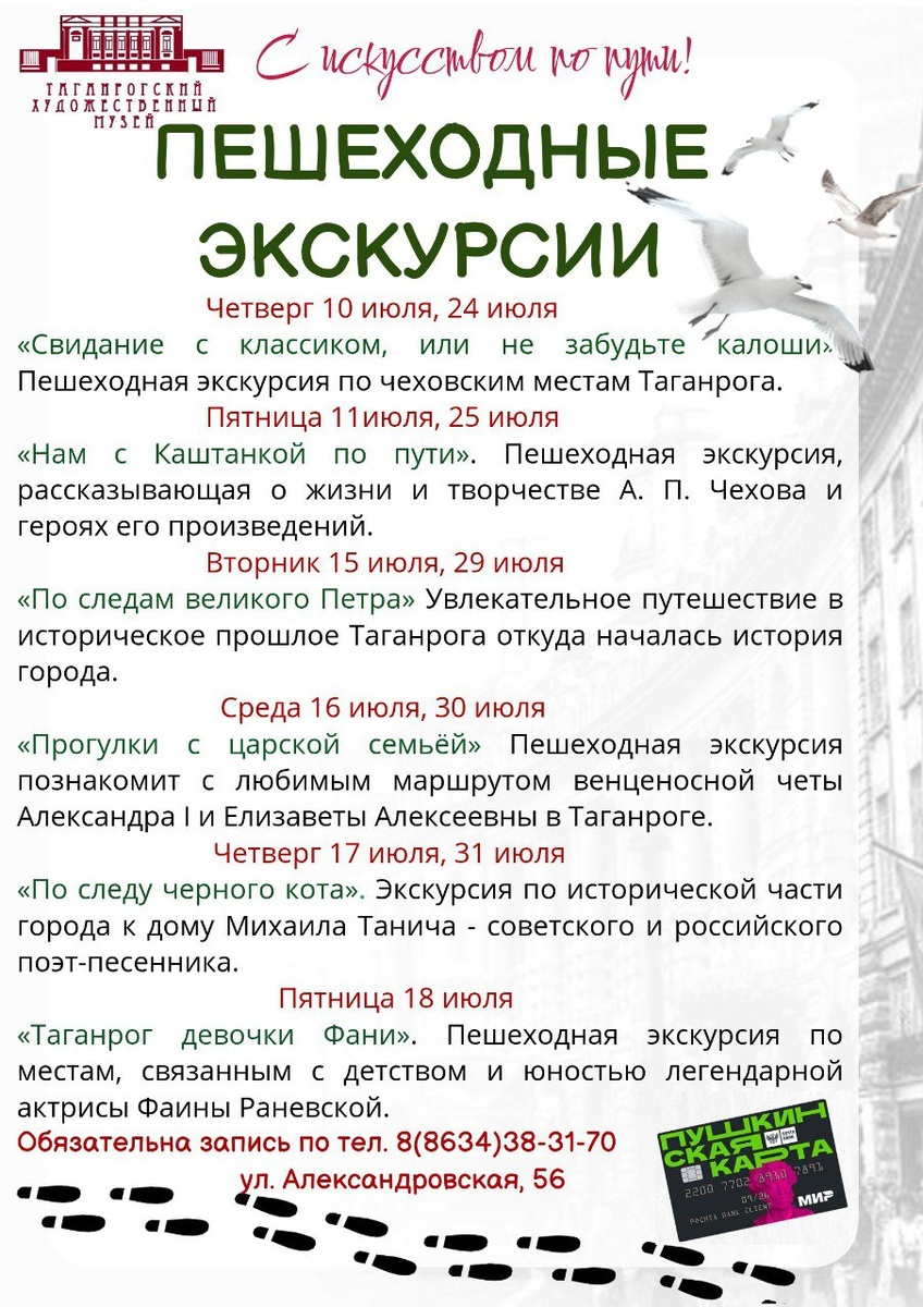 Коллектив Таганрогского художественного музея продолжает работать для вас! 🧡 В ТХМ представлены разнообразные пешеходные экскурсии для любителей познавательных путешествий. Узнайте любимый город с новой стороны с помощью Пушкинской карты! Обязательная предварительная запись по телефону: 38-31-70. https://artmuseumtgn.ru/пешеходные-экскурсии/