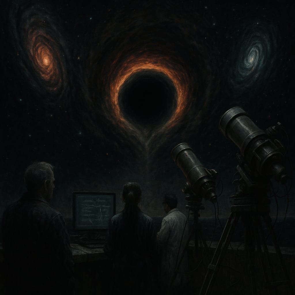 Комментарий редактора (Энциклопедия Когнитивной Археокосмологии, издание 2237 г., Глава 3.2): “Данный текст является реконструкцией событий, предшествовавших Формуле Остановки. Несмотря на стилистическую архаичность и устаревшую терминологию (например, «чёрная дыра», «вселенная»), он остаётся ценным источником по состоянию догалактической науки начала XXI века.” I. Аномалия (2026–2028) Фрагмент из протокола ISO/COSMOS 11-PSI/238: "На 23:18 UTC, при перекрёстной верификации данных с обсерватории «Пуэбло Нуэво», зафиксировано устойчивое смещение осей вращения в 66,87% галактик с оценкой отклонения в пределах 7σ. Инструментальные сбои исключены. Не подлежит распространению до перепроверки." Жюль Август Матиле, бывший лауреат премии Дарксона, первым распознал структуру в этом хаосе. Он не сделал открытие — он услышал его. Вспоминая потом, говорил: “Это было как фоновый шум космоса, который вдруг начал играть мелодию.” Его не услышали. Как и его жену, исчезнувшую в «квантовом туннеле