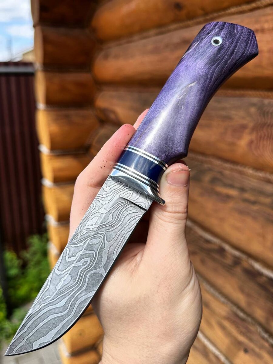 Маленький рабочий нож «Беркут» из дамасской стали в 950 слоев. Рукоять на ноже теплая из стабилизированной карельской березы фиолетовой. Гарда травмобезопасная. Нож заточен в бритву. Твердость клинка (HRC): 62 Цена за нож: 8.032 рублей. В комплекте идут ножны из натуральной кожи. Можем сделать формованные ножны +8000 рублей. Для заказа писать на @Nazarklinokbot или по тел +79101343831 WhatsApp/Viber