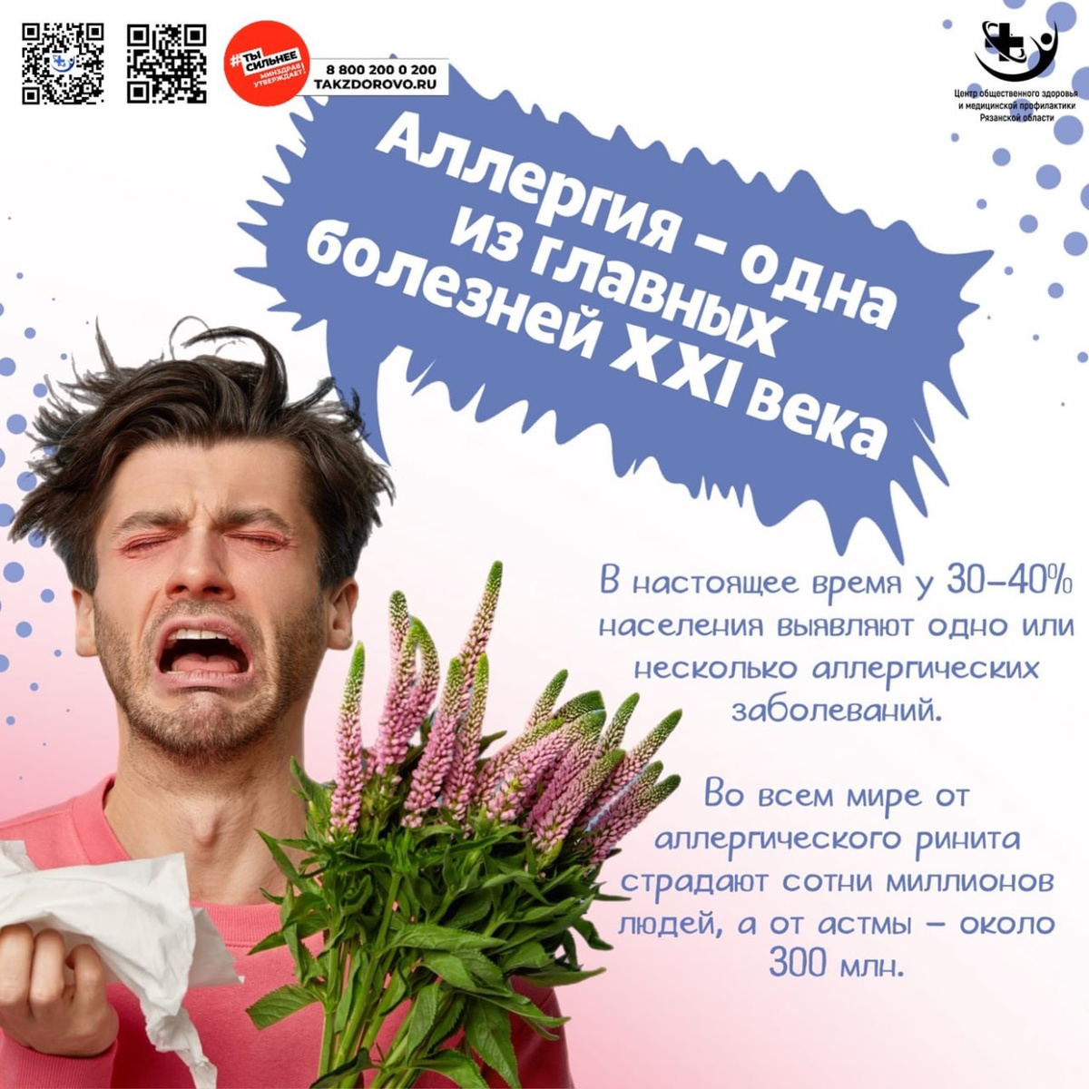 Неделя профилактики аллергических заболеваний! 🌍 Аллергия — одна из главных болезней 21 века. С каждым годом она затрагивает всё больше людей, и ученые связывают это с экологией, питанием и образом жизни. 🔹 Почему аллергия так распространена? ✔ Ухудшение экологии ✔ Обилие химических добавок в продуктах ✔ Чрезмерная гигиена (гипотеза "чистого мира") ✔ Наследственность 🔹 Как защититься? ✅ Выявлять аллергены (анализы, наблюдение) ✅ Укреплять иммунитет ✅ Следить за питанием и окружающей средой ✅ Консультироваться с врачом, а не заниматься самолечением Аллергия может серьезно влиять на качество жизни, но с ней можно справиться! Главное — вовремя принимать меры. Будьте здоровы и дышите свободно! 💙 #Аллергия21Века #Профилактика #Здоровье #НеделяБорьбыСАллергией #Здоровоебудущее #Здоровоебудущее62 #ЗдороваяРязань