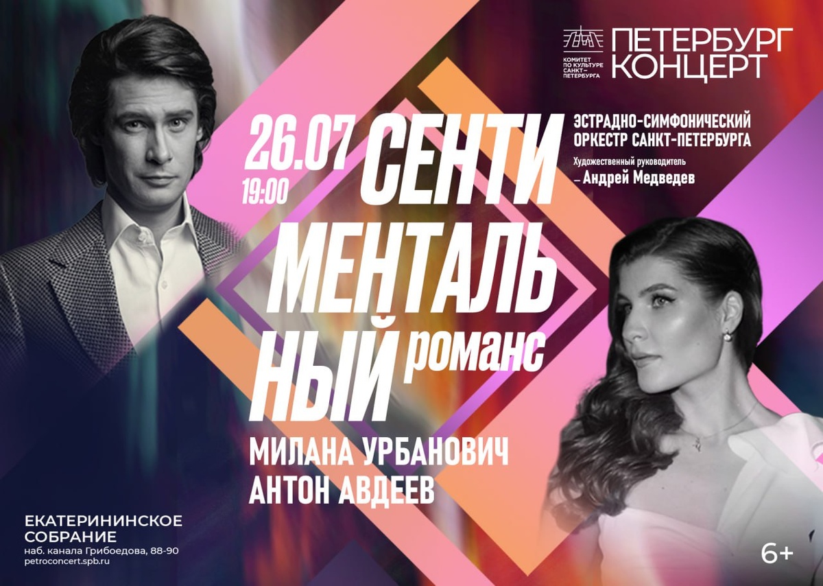 После невероятного успеха «Симфонии The Beatles» Эстрадно-симфонический оркестр Санкт-Петербурга подготовил для зрителей новую вдохновляющую программу «Сентиментальный романс», которая будет представлена 26 июля в Екатерининском собрании. Концерт выстроен как элегантный и проникновенный вокальный диалог двух миров — мужского и женского. Нежные соло Миланы Урбанович сменяются эмоциональными монологами Антона Авдеева. Трепетная молитвенность переплетается то с ностальгией по отшумевшему карнавалу, то со щемящей грустью, то с неистовой радостью жизни. Оркестр будет мягко сопровождать и поддерживать вокалистов, помогая этому хрупкому диалогу сердца и души обрести совершенную форму. Кульминация вечера — страстный дуэт, воплощающий всю силу и суть вечной любви. Художественный руководитель и дирижер — Андрей Медведев. БИЛЕТЫ: 26.07 | 19:00 | Сентиментальный романс