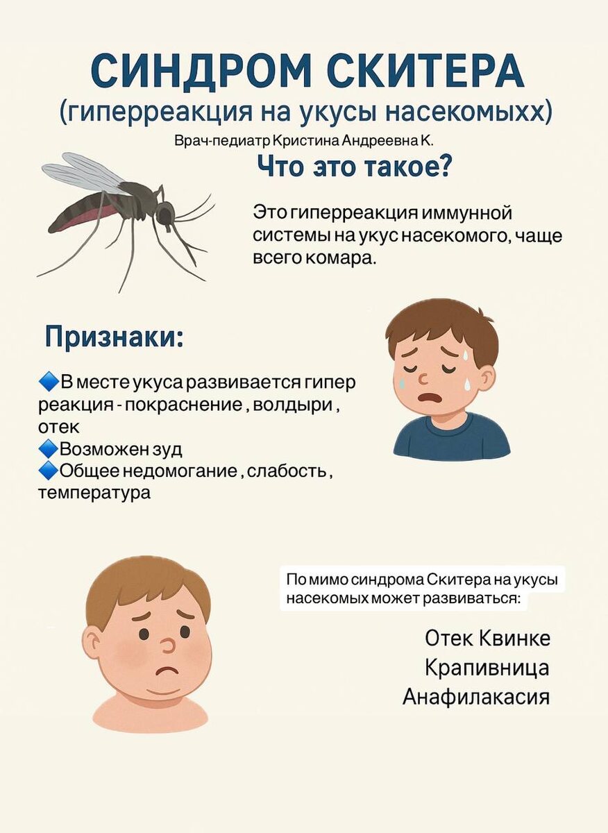 Синдром Скитера: что это? ➗➗➗➗➗➗➗➗➗➗ 💡Это гиперреакция иммунной системы на укус насекомого, чаще всего комара. Такая реакция чаще наблюдается у детей младшего возраста. ⬇️Как проявляется: ➡️Сначала — покраснение и точка укуса, затем: ➡️волдырь, отек, ➡️может лопаться, возникать эрозия, ➡️иногда некроз тканей. Возможны: 🌟Субфебрильная температура, слабость, капризы, 🌟зуд (не всегда). Сколько длится: до 10 дней, зависит от индивидуальной реакции. 📍Состояния, которые могут сопровождать или напоминать синдром Скитера: 🕖Отёк Квинке, 🕙Крапивница, 🕚Анафилактический шок (редко, но опасно). 🔻Что делать? Профилактика: 🔜Репелленты, 🔜Закрытая одежда, 🔜Москитная сетка на коляску/кроватку, 🔜Избегать мест скопления насекомых. 🔻После укуса: ✔️Антигистаминные: 🕖Фенистил (капли/гель), 🕖Зиртек, Зодак, Эриус — внутрь. ✔️Гормональные мази (по назначению врача): 🕚Комфодерм, 🕚Адвантан, 🕚Элоком и др. ☑️При сильной реакции/отеке: Гормоны внутрь или инъекции (только по назначению врача!).