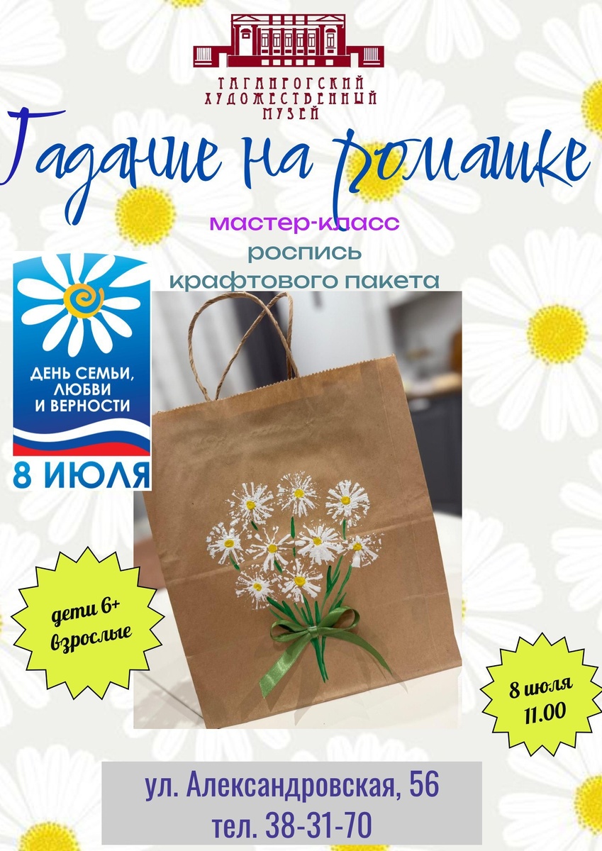 Дорогие друзья! Летняя мастерская чудес продолжает свою работу в скульптурном дворике музея! В День семьи, любви и верности, 8 июля в 11.00 приглашаем всех детей и взрослых на мастер-класс "Гадание на ромашке". Вы сможете сделать свой неповторимый рисунок на крафтовом пакете, который может послужить в качестве упаковки подарка для самых близких и любимых. Запись по тел. 8(8634)38-31-70 ул. Александровская, 56