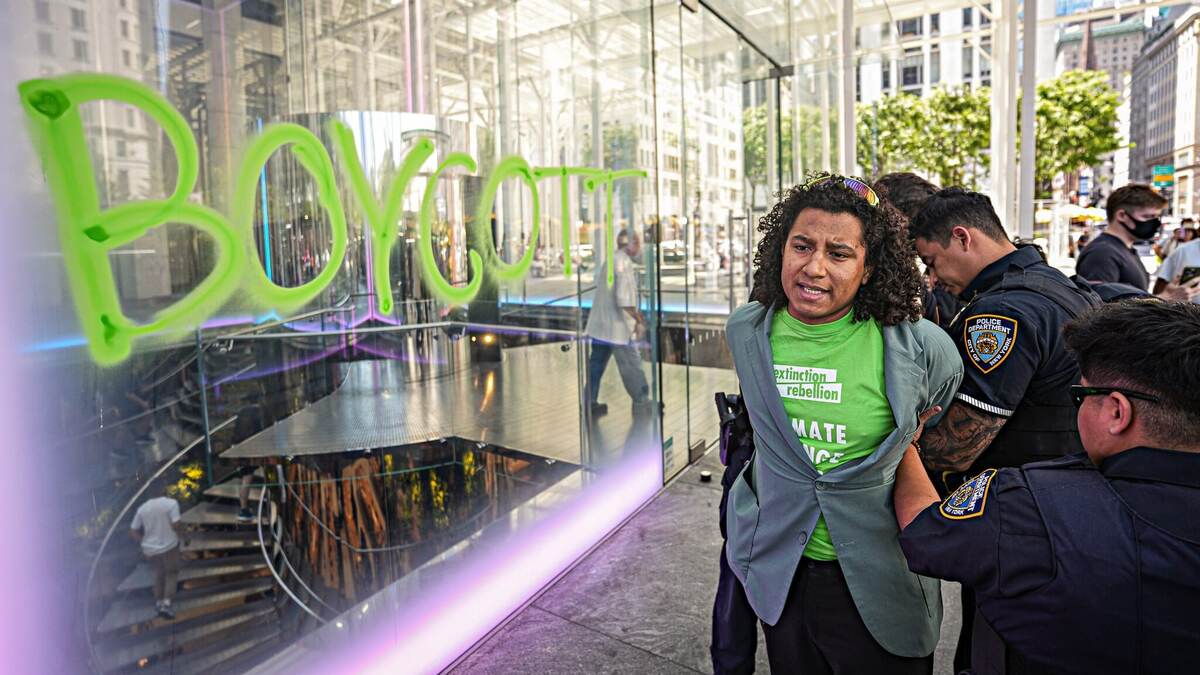 Флагманский магазин Apple на Пятой авеню в Нью-Йорке подвергся атаке со стороны климатических активистов. Утром на стеклянном фасаде здания появились три граффити: логотип Apple с надписью «Boycott», фраза «Dump Trump, Apple!» и слоган «Tim + Trump = Toxic». Все надписи были нанесены одним человеком, которого задержала полиция на месте. На фоне громких лозунгов и скандирования участников акции представители службы безопасности Apple начали оперативно смывать краску. Первым был стёрт фрагмент с упоминанием Тима Кука. Ответственность за акцию взяло на себя движение Extinction Rebellion. Его представители заявили, что Apple лицемерно демонстрирует экологические цели, при этом её генеральный директор поддерживает Дональда Трампа — политика, отвергающего климатическую повестку. Активисты напомнили, что в 2023 году Тим Кук называл борьбу с изменением климата «одним из важнейших приоритетов современности», а в 2025 году поддержал Трампа — президента, который «откатывает назад все достижения в