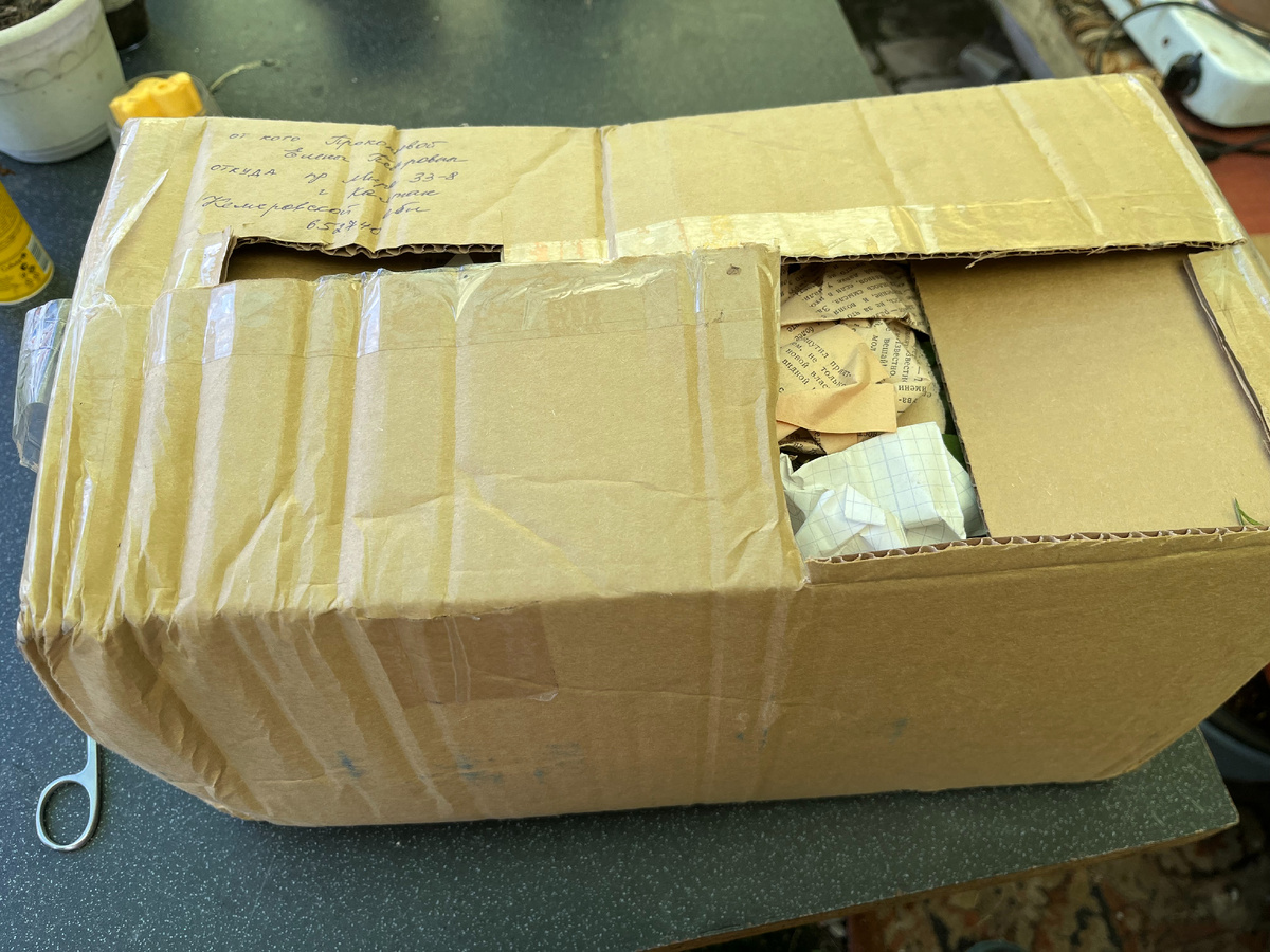 На коробке срезана квитанция, так посылку забирали с сортировки.