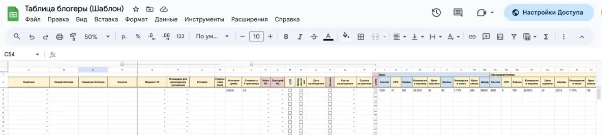 Для продажи на WB или OZON есть удобная таблица, которая уже готова для подсчёта конверсии, ROI и прочих критериев.