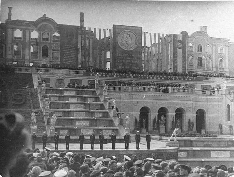 Панорама Большого каскада перед пуском фонтанов 14 сентября 1947 года.