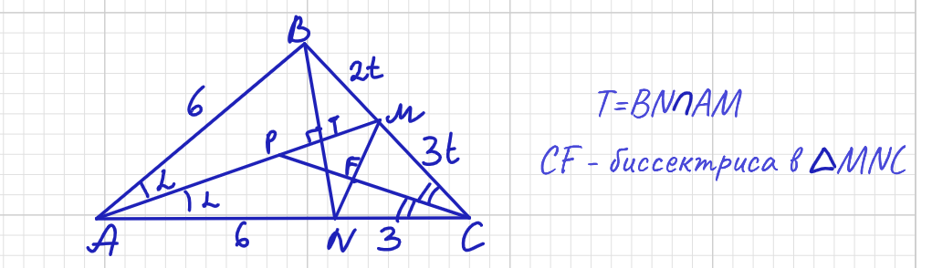 Здравствуйте, дорогие подписчики и гости канала Предлагаю рассмотреть одну из задач, которые были на пересдаче. Сам вариант можно посмотреть тут В треугольнике 𝐴𝐵𝐶 проведена биссектриса 𝐴𝑀. Прямая, проходящая через вершину 𝐵 перпендикулярно 𝐴𝑀, пересекает сторону 𝐴𝐶 в точке 𝑁. Известно, что 𝐴𝐵 = 6, 𝐵𝐶 = 5, 𝐴𝐶 = 9. a) Докажите, что биссектриса угла 𝐶 делит отрезок 𝑀𝑁 пополам. б) Пусть 𝑃 – точка пересечения биссектрис треугольника 𝐴𝐵𝐶. Найдите отношение 𝐴𝑃 : 𝑃 N? Со вторым пунктом я не увидела свойство серединного перпендикуляра, поэтому решила найти AP и PN. Поэтому предлагаю вот такой способ решения через теорему косинусов: Спасибо за внимание, до новых встреч