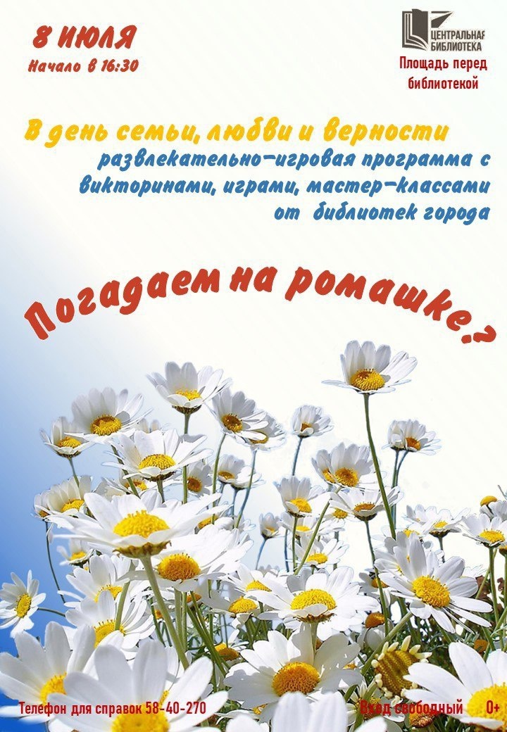 Программа праздничных мероприятий, посвящённых Дню семьи, любви и верности Памятник Петру и Февронии, ул. Энгельса, 14 8 июля Городской праздник 16:30 Праздник на площади перед библиотекой: – Книжная выставка «Под покровом Петра и Февронии» – «Любовь не от слов, а от дел познается» (Святитель Тихон Задонский) – цитаты о семье, любви и верности в подарок. Любой посетитель праздника сможет наугад выбрать карточку с цитатой на память – «Ромашка» – аквагрим 17:00 Торжественное мероприятие. В программе: выступление официальных лиц, поздравление и награждение семей города, праздничный концерт с участием солистов и коллективов ГДК Городской парк, пр. Ленина 8 июля 16:00-18:00 Вечер современной поэзии «Я вас люблю…» посвящённый Дню семьи, любви и верности, свободный поэтический микрофон ДК ФЭИ, пр. Ленина, 15 11 июля 18:00 Праздничный концерт с участием коллективов и солистов города Парк «Усадьба Белкино», ул. Борисоглебская 12 июля 11:00-19:00 Семейный фестиваль. МастерГрад Городская биб
