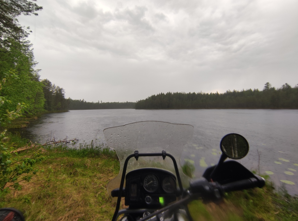 Проснулся в 05:30. Да, ночь была не спокойная. Было холодно и сыро, а утром снились беспокойные сны. За ночь уровень воды увеличился более чем на два метра, и вода стояла в нескольких шагах от палатки, хотя ночью у берега был обрыв, и вода была где-то там внизу. Как я узнал позже, Мезень – река, в которой колебание уровня воды из-за прилива одна из самых больших, и может достигать 6-7, и даже 10 метров. Повезло, что я еще не уплыл никуда. Спать дальше не намерен. Выезжаю из Мезени. Начинается мелкий дождик, как будто водяная взвесь летает в воздухе. Но дорога по сравнению со вчерашним вечером более сухая, видимо подвыветрилась. Около 9 утра подъезжаю к Лешуконскому, впереди река Мезень, а чтобы добраться до села надо переправиться на другой берег. Понтон еще не поставили. Курсирует паром. Видимо он отчалил к другому берегу незадолго до моего приезда. Придется ждать. Пока инспектирую мотоцикл, всё хорошо, только крепление ветровика пришлось немного подтянуть.