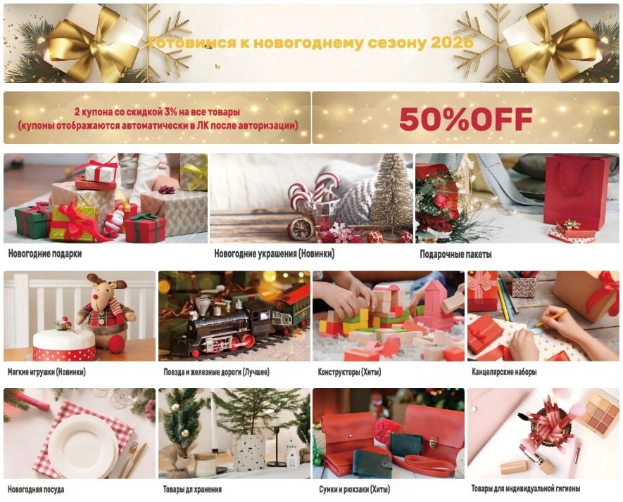 Акция «Готовимся к Новому году 2026» началась! Успейте вовремя закупить хиты продаж для новогоднего сезона! Новогодняя акция уже началась, пора воспользоваться бонусами, которые мы приготовили для вас! Возможная прибыль от реализуемого товара может достигнуть 30%! Мы подготовили для вас новогодние подарки (игрушки, аксессуары для кухни, товары для дома) и украшения. А также: мягкие игрушки, железные дороги, конструкторы и канцтовары. В период акции 07.07-08.08 для вас действуют следующие бонусы: 1. 2 купона на скидку 3% 2. При покупке товаров на 100000 ₽ - дарим купон на 2000 ₽ При покупке товаров на 500000 ₽ - дарим купон на 6000 ₽ При покупке товаров на 1000000 ₽ - дарим купон на 10000 ₽ Для более подробной информации об акции авторизуйтесь у нас на сайте.