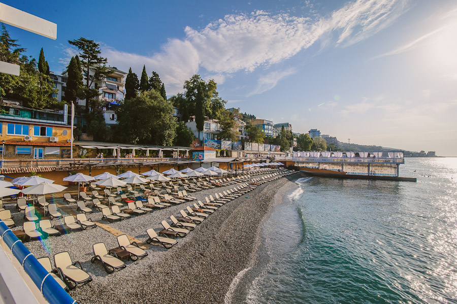 Это единственный в Ялте пляж, удостоенный международного сертификата «Голубой флаг». Здесь чистая вода, ухоженная территория и развитая инфраструктура.