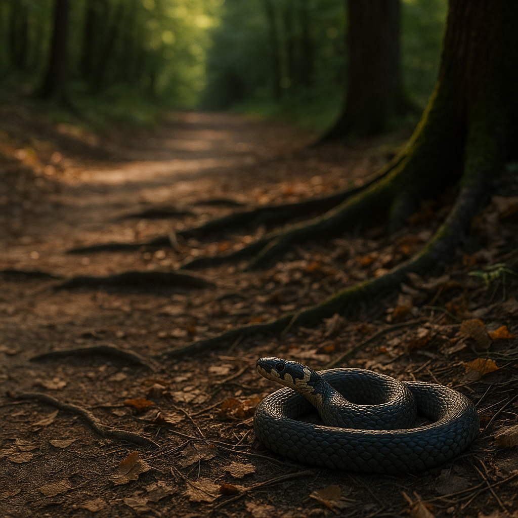 Если идти от просеки к болотцу — минут 15 пешком, не спеша, — то найдёшь одну странную тропу. Тихая, безлюдная. Много сухих листьев, кое-где корни поверх земли. И вот уже третий раз за лето я замечаю: змей там нет. А ведь должно быть наоборот. Вокруг — болотистые места, солнце пригревает, мышей полно. Но змеи будто нарочно эту дорожку обходят. Не знаю, как объяснить, но чувствуешь это — когда уже трижды идёшь в те края, и каждый раз вроде бы подходящие условия, а ни ужа, ни гадюки. Позвонил знакомому — он из тех, кто лес изучает не по книжкам, а ногами. Сказал: «Ты думаешь, ты идёшь по тропе. А змея видит в ней полосу шума и страха». Ну, не дословно, но смысл такой. Змеи улавливают вибрации телом. То есть не уши, не глаза — а прямо всем собой. Если по тропе прошёл человек с собакой — змея это "слышит", даже если уже никто не идёт. И ей туда не надо. А ещё запах. Сапоги, дезодорант, крем от загара, бензин с руля велосипеда — всё это остаётся в воздухе. Нам не слышно, а у змеи — как б