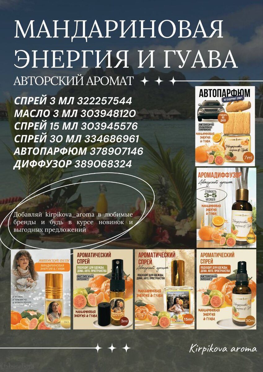 АВТОРСКИЙ АРОМАТ «ЦИТРУС» Этот аромат, пожалуй, самый яркий, интенсивный, энергичный. Дарит заряд бодрости и хорошее настроение. Он подчиняет и заставляет других поворачиваться вам в след с взором полным восхищения и вопрошания, что же за дивный аромат вы носите. Спрей 3 мл Арт. 322257532 Масло 3 мл Арт. 114996376 Спрей 15 мл Арт. 240105784 Спрей 30 мл Арт. 240726763 Автопарфюм Арт. 378907137 Аромадиффузор Арт. 389068317 🏬 ВБ https://www.wildberries.ru/catalog/240105784/detail.aspx