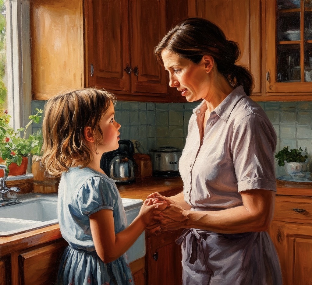 В этот момент в кухню вошла дочка и посмотрела на них снизу вверх. В её глазах читалась хрупкая смелость, не по годам взрослая.