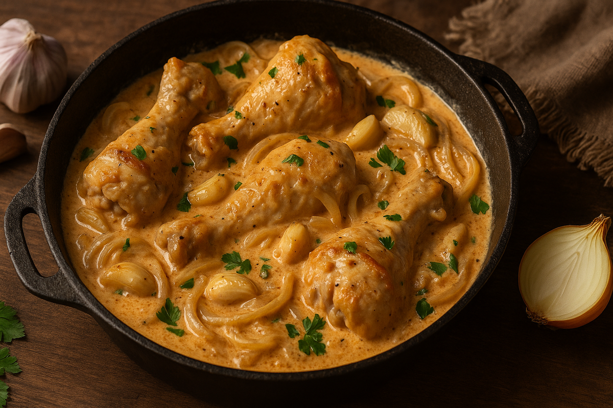 Куриные ножки в сметанном соусе — классика русской домашней кухни, которая возникла благодаря доступности сметаны как основного молочного продукта в России. Тушение мяса в сметане позволяет сделать его нежным и сочным, а добавление лука и чеснока придаёт блюду аромат и насыщенность. Этот способ приготовления был особенно популярен в деревнях и небольших городах, где простые, но вкусные блюда ценились за питательность и лёгкость в приготовлении. Со временем рецепт обогатился специями и дополнительными ингредиентами, но основа осталась неизменной — курица, сметана и душистые приправы.