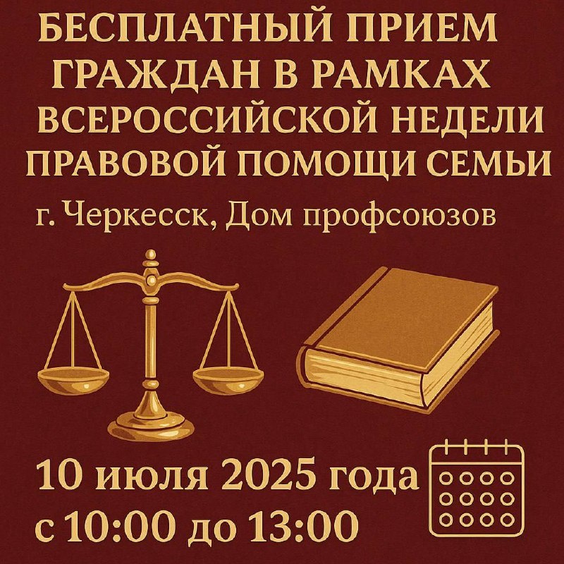 🔖Всероссийская неделя правовой помощи: совместный прием граждан в КЧР 10 июля 2025 года с 10:00 до 13:00 на базе Дома профсоюзов (г. Черкесск, пр.Ленина, 34) состоится бесплатный прием граждан в рамках Всероссийской недели правовой помощи семье. Кто проводит? - Региональный исполком Народного фронта в КЧР - Юридическая клиника (консультация) СКГА - Центр правовой помощи «Ресурс» - Объединение профсоюзов КЧР - Республиканский Центр психолого-педагогической, медицинской и социальной помощи Какие вопросы можно задать? 🔸Правовая поддержка семейных пар (брачные договоры, алименты, наследство) 🔸Защита интересов детей (опека, образование, льготы) 🔸Жилищные и имущественные споры (раздел имущества, ипотека) 🔸Социальные гарантии (материнский капитал, пособия) 🔸Психологическая помощь (конфликты в семье, стрессовые ситуации) Как принять участие? 🤩Адрес: пр.Ленина, 34, Дом профсоюзов 🤩Дата: 10 июля 2025 г. 🤩Время: 10:00–13:00 🤩8-928-389-983-1 Предварительная регистрация не требуется