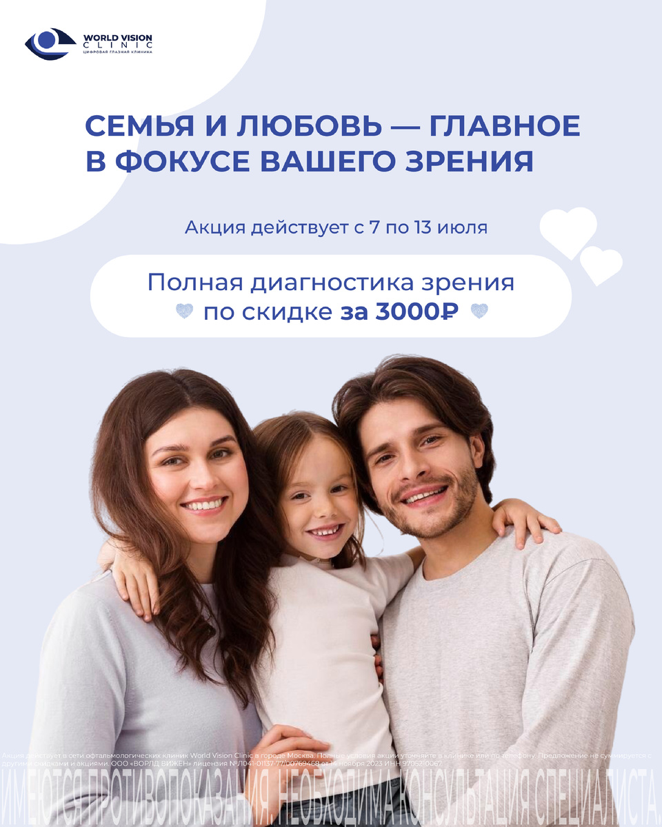 В честь Дня семьи, любви и верности мы хотим напомнить, как важно заботиться о дорогих людях и о том, что позволяет нам видеть их лучше всего – о нашем зрении! Семья, любовь, верность – самое ценное, что у нас есть, и мы хотим переживать и запоминать совместные моменты в каждой детали. Чтобы вы могли наслаждаться каждым взглядом, каждой улыбкой ваших близких, мы подготовили особенное предложение: — полная диагностика зрения со скидкой всего за 3000 рублей в Москве, 1980 рублей в Санкт-Петербурге и за 980 рублей в Красноярске! Своевременная проверка – это ваш вклад в собственное здоровье и долголетие. Ведь хорошее зрение позволяет оставаться активным и вовлеченным в жизнь семьи на долгие годы. Погрузитесь в теплые семейные моменты замечайте радость в глазах любимых и цените моменты вместе. Акция действует с 7 по 13 июля. Сделайте подарок себе и своим близким – подарите им уверенность в каждом дне! World Vision Clinic — помогаем вам видеть главное.