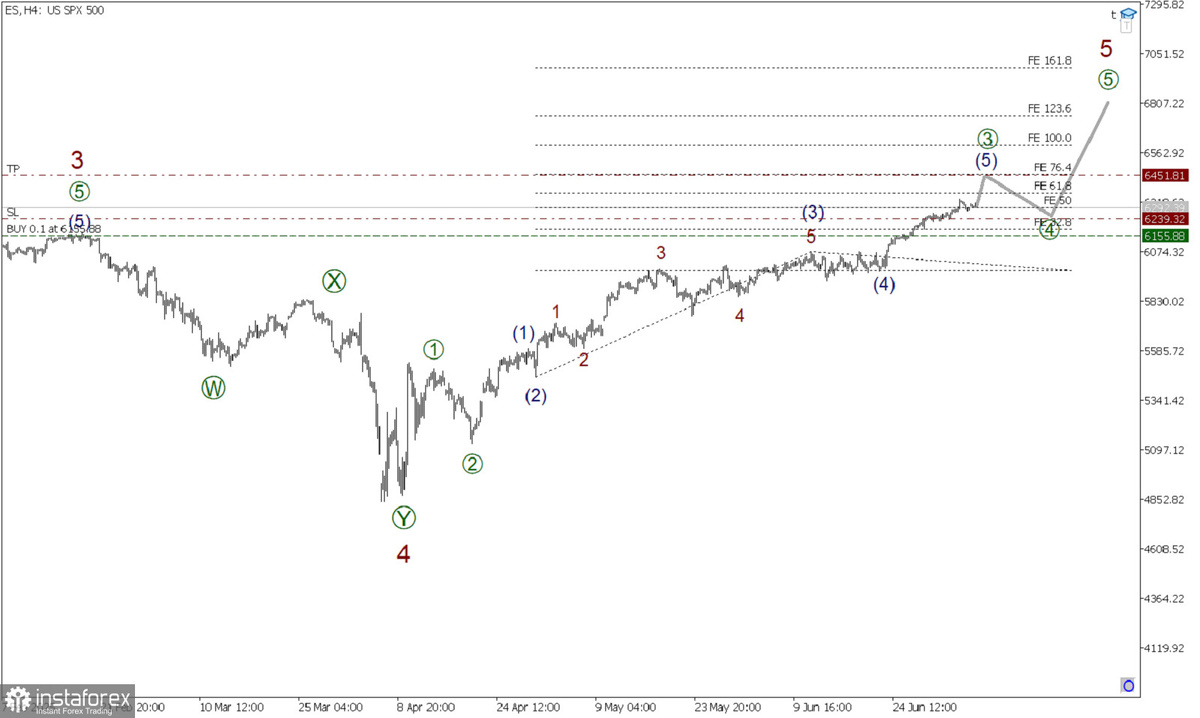В глобальной перспективе по индексу SP500 может формироваться крупный импульс (1)-(2)-(3)-(4)-(5). Подволна (1) и (2) сформированы. На последнем участке графика представлена восходящая импульсная волна (3), размеченная подволнами 1-2-3-4-5. В составе волны (3) завершенными смотрятся подволны 1-2-3-4. Коррекционная волна 4 не так давно подошла к концу и приняла форму двойного зигзага. На последнем участке цены мы можем наблюдать построение новой и финальной волны 5. Волна 5 может принять форму импульса [1]-[2]-[3]-[4]-[5]. Завершены подволны [1]-[2], и сейчас растем в более мощной подволне [3]. Вероятно, быки нацелены на предыдущий максимум 6451.81, который отмечен импульсом 3. В текущей ситуации можно рассматривать открытие длинных позиций с целью забрать прибыль на завершении импульсного роста в районе предыдущего максимума. Торговые рекомендации: Buy 6292.39, takeprofit 6451.81. Все экономические новости России от FX.co *Представленный анализ рынка носит информативный характер и не я