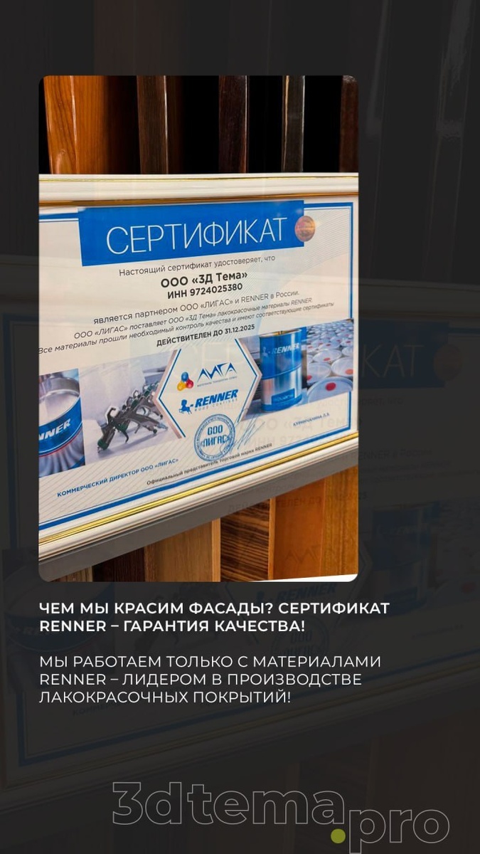 Просто знайте: мы красим фасады только итальянскими эмалями RENNER — эталоном стойкости и глубины цвета 🎨 ✅ Идеально ровное покрытие ✅ Насыщенный цвет без подтеков ✅ Защита на десятилетия Ваши фасады заслуживают лучшего! 💚 Всегда на связи для ваших проектов! Ответим на вопросы и поможем с выбором! 📱 Telegram 📱 WhatsApp 📱 Сайт: 3dtema.pro 📲 +7 495 278 08 44 ✉️ info@3dtema.ru В этом посте есть большое видео, которое не загрузилось в Дзен. Откройте оригинал поста в телеграме, чтобы его посмотреть