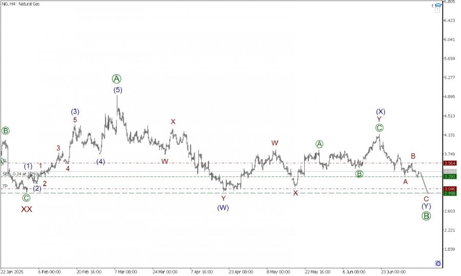 https://basechop.ru/wordpress/?p=49673 Глядя на текущий график, можно заметить, что по Газу может формироваться крупный коррекционный тренд. На текущем графике представлена разметка большой действующей волны (Y), принимающей форму тройного зигзага W-X-Y-XX-Z. На текущем графике мы видим, что действующая волна Z похожа на стандартный зигзаг, внутри которого завершен импульс [A]. Сейчас может формироваться коррекционная подволна [B], которая, судя по всему, принимает форму двойного зигзага (W)-(X)-(Y). Предполагается, что на сегодняшний день завершена только первая действующая волан (W), она приняла форму двойного зигзага W-X-Y. Сейчас в процессе развития может находиться противодействующая волна связка (X), она тоже представляет собой двойной зигзаг W-X-Y. На последнем участке графика может формироваться финальная зигзагообразная волна Y. Внутри волны Y могла подойти к концу коррекционная подволна [B]. Но в приоритете вариант в котором ее развитие продолжается. Есть большая вероятность,