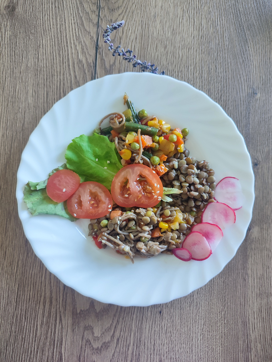 Рецепт подходит к любому приёму пищи: на завтрак/ обед/ ужин. Мне нравится есть это блюдо на завтрак, потому что оно отлично насыщает 🙂 В следующий раз есть захочется через 3-4 часа. 1. Чечевицу замочить на ночь. 2. Собу можно отварить накануне, но это необязательно. 🔹 Сварить чечевицу. Добавить йодированную соль по вкусу. 🔹 Разогреть масло на сковороде, обжарить до золотистого цвета репчатый лук. Затем добавить замороженные овощи и соль по вкусу. 🔹По готовности овощей добавить на сковороду собу (гречневую лапшу), перемешать и обжаривать вместе с овощами ещё пару минут. 🔹 Выложить на тарелку лапшу с овощами, чечевицу и украсить дольками редиса, томата и салатной зеленью. 🔹 Сбрызнуть всё лимонным соком и украсить кунжутом. Приятного аппетита! 🤩 #вегетарианский_рецепт #сбалансированная_тарелка #вегетарианская_тарелка #vegblog # постное_блюдо
