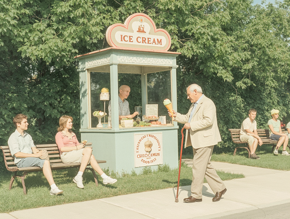Иногда он глядел на других покупателей и удивлялся: как они могут не замечать? Вот этот человек, с морщинами на висках и добрым упрямством в походке, приходит сюда не просто за мороженым. Он приходит за памятью. И держит её бережно — как мороженое в вафельном стаканчике, пока не растаяло.