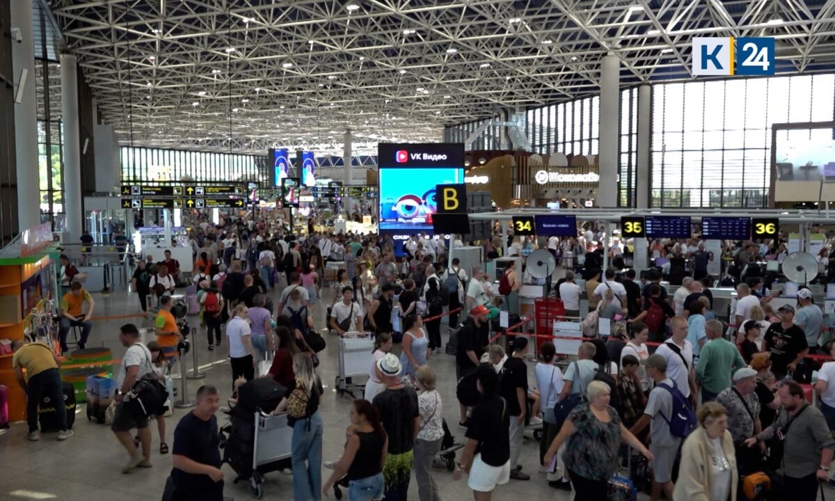 Видео канала «Кубань 24» «Аэропорт Сочи работает штатно, однако, как показывает онлайн-табло, рейсы в том числе в Москву и Санкт-Петербург задерживаются», — сообщает специальный корреспондент телеканала «Кубань 24» Юлия Проценко. Коллапс произошел в российских аэропортах на фоне масштабной атаки украинских беспилотников. Были отменены и задержаны сотни рейсов. В Сочи, как и в других воздушных гаванях, пассажиры ждут вылета своих самолетов в разные регионы страны. В Шереметьево задерживались свыше 60 рейсов. В аэропорту Нижнего Новгорода люди сутки не могли вылететь. Ограничения на вылет также вводились в петербургском Пулково. С 5 июля авиакомпании отменили 485 рейсов, почти 2 тыс. было задержано. В Сочи следующих в Шереметьево пассажиров размещают в гостиницы, уведомляя по громкой связи. Семья Гавриловых надеется улететь в Москву, рейс задержали до вечера. — Кто дольше всех находится — им предлагали воду и еду. Нам пока еще три часа до вечера, посмотрим, что будет дальше. Пассажиров о