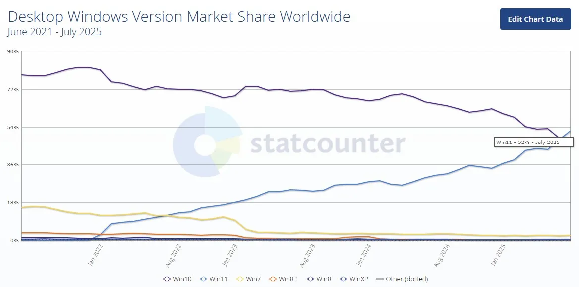 Спустя почти четыре года после релиза Windows 11 наконец преодолела важный рубеж, став самой популярной настольной ОС в мире. Согласно данным StatCounter, её рыночная доля достигла 52%, в то время как Windows 10 теперь занимает 44,59%. Это событие произошло за несколько месяцев до окончания поддержки "десятки", запланированного на 14 октября. Изображение: StatCounter Интересно, что среди геймеров Windows 11 вышла вперёд ещё в сентябре 2023 года, но в общем сегменте долгое время уступала предшественнице. Утечка внутренних данных Microsoft осенью прошлого года показала, что новая ОС установлена на более чем 400 млн устройств. Однако темпы её распространения оказались вдвое медленнее, чем у Windows 10, которой для достижения аналогичного показателя потребовался всего год. Главной причиной замедленного внедрения Windows 11 стали жёсткие системные требования, исключившие миллионы ПК с устаревшими процессорами и недостаточным уровнем безопасности. Microsoft продолжает активно стимулировать п