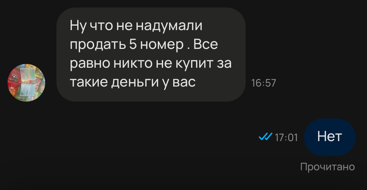 Просит продать ему редкий вкладыш из жвачек «Флинстоуны» за 1000 рублей. А я хочу дороже и капризничаю 😁 После того, как я отказала в торге первый раз, он через пару дней уточнил, не передумала ли я: