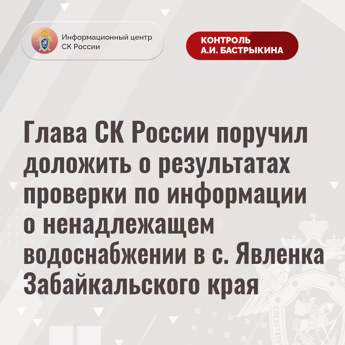 Глава СК России поручил доложить о результатах проверки по информации о ненадлежащем водоснабжении в с. Явленка Забайкальского края В СМИ сообщается о нарушении прав жителей села Явленка Забайкальского края на качественное водоснабжение. Единственным источником питьевого ресурса в населенном пункте является водозаборная башня, расположенная на режимном объекте старательной артели, откуда его доставляет специализированный транспорт. Кроме того, отмечается, что в селе отсутствует медицинский пункт, при этом общественный транспорт до других населенных пунктов не курсирует. Многочисленные обращения местных жителей в компетентные органы результатов не принесли, мер к разрешению проблем не принимается. В СУ СК России по Забайкальскому краю по данному факту начата процессуальная проверка. Председатель Следственного комитета Российской Федерации Александр Иванович Бастрыкин поручил руководителю СУ СК России по Забайкальскому краю Алексею Юрьевичу Вольному представить доклад о ходе и результата