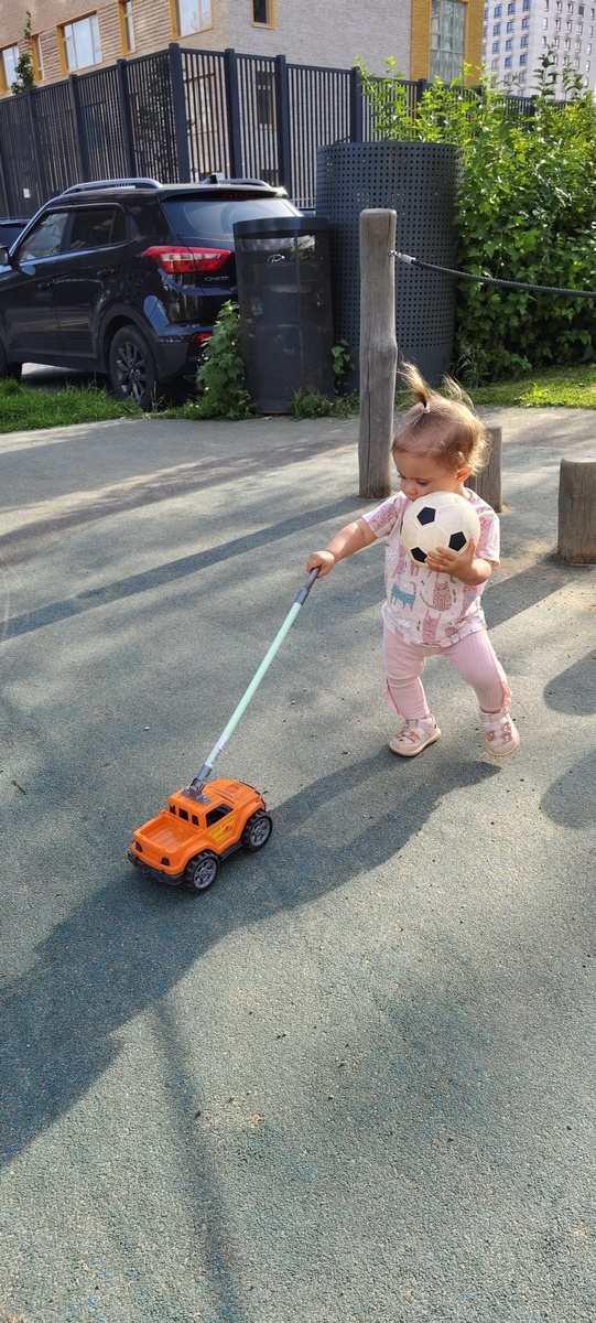 Новый день - новый мячик и новая каталка 😁 У Арианны появилась очень хитрая тактика на детской площадке. Она берет свой мяч, идёт к любому понравившемуся ребенку и с улыбкой протягивает ему свой мячик. Все вокруг тут же умиляются какая добрая девочка. И предлагают ей взамен свои игрушки. А доброй хитрой девочке только это и надо 😁