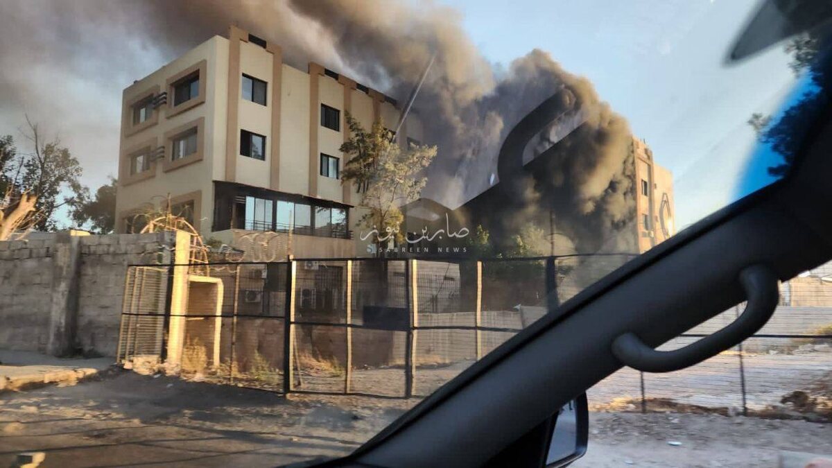 Billowing smoke rises above Syrian General Authority for Radio and Television after explosion heard behind building