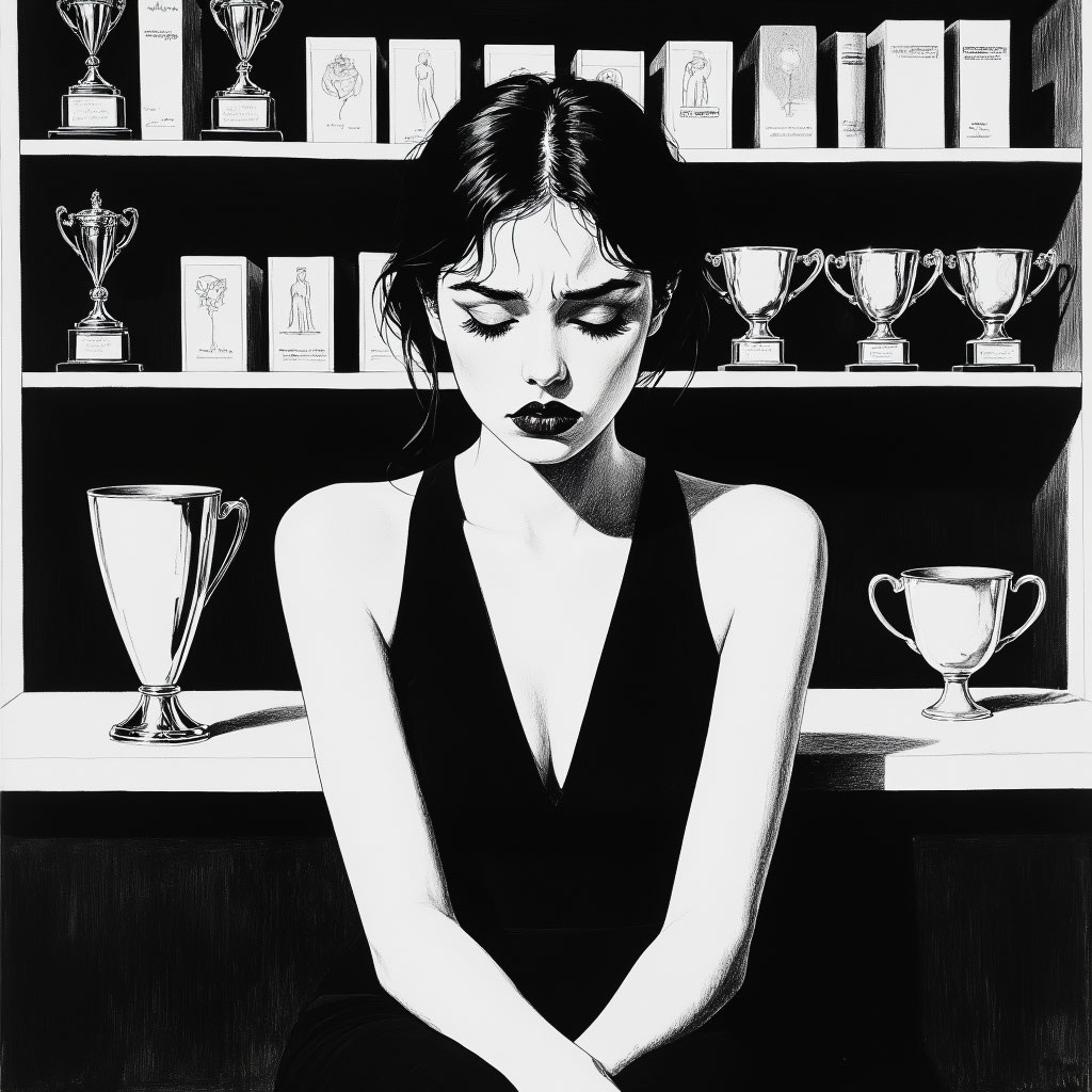 В самом начале рабочего дня ко мне в кабинет заглянула миссис Эвелин — женщина с пустым взглядом и слишком аккуратным маникюром. «Я пришла заявить о пропаже, — прошептала она, разглядывая свои руки. — У меня украли... мечту». За дверью тактично кашлянул Бекински. Он стоял с подносом, на котором дымились две чашки кофе. «Шеф, похоже, у нас новое дело. И, кажется, оно личное». Кабинет миссис Эвелин напоминал музей образцовой жизни: «Видите? — она провела пальцем по пыльной полке. — Здесь должен был стоять кубок. За первое место в конкурсе живописи. Я готовилась к нему 15 лет назад». Бекински нашёл главную улику — школьный дневник с набросками в уголках страниц. На последнем рисунке красовалась подпись: «Когда-нибудь я...» Дальше шла клякса, словно кто-то поспешно захлопнул тетрадь. Мы начали с опроса «подозреваемых» — тех, кто мог быть причастен к исчезновению мечты. 1. Господин «А-Что-Скажут-Люди»