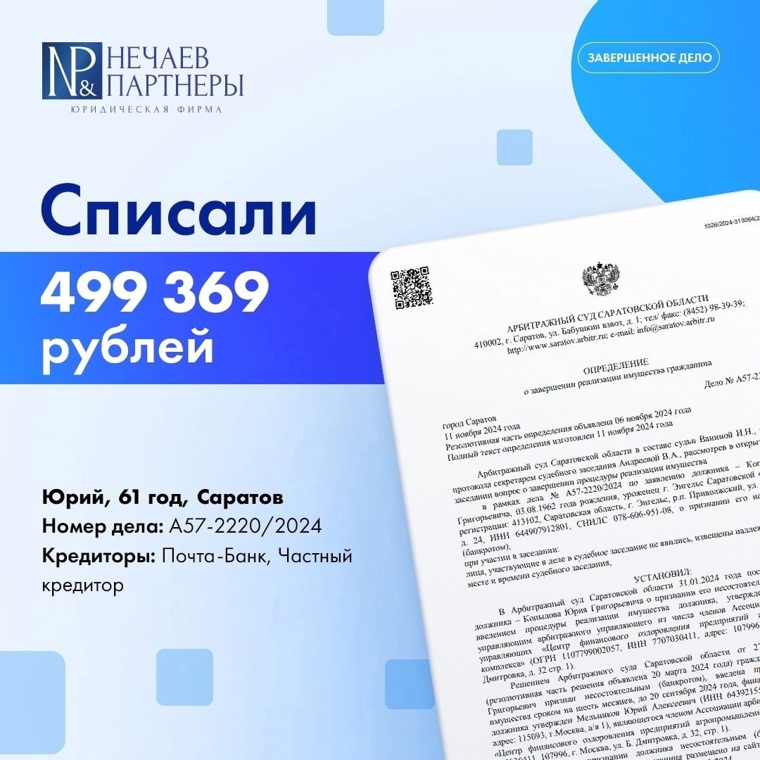 Бизнес прогорел, а банк требовал свое... Юрий, житель Саратова, всегда был человеком трудолюбивым и ответственным. Большую часть своей жизни он посвятил работе инженером на крупном промышленном предприятии. Однако всё изменилось, когда он решил помочь своему сыну. Юрий оформил для него 2 потребительских кредита для развития семейного бизнеса. В результате общая сумма задолженности перед двумя банками составила 499 369,16 рублей. К сожалению, семейный бизнес не оправдал ожиданий, а сын потерял работу из-за сокращения. Постоянные звонки от банков и коллекторов, давление и угрозы превратили жизнь в ад. Не желая сдаваться, Юрий обратился в нашу юридическую фирму в поисках поддержки и решения проблемы. Мы внимательно выслушали его историю и предложили пройти процедуру списания, чтобы списать его долги и дать ему возможность начать жизнь заново. Имя: Юрий Возраст: 61 год Город: Саратов Сумма долга: 499 369 рубля После нескольких месяцев напряжённой работы и сбора документов дело было у