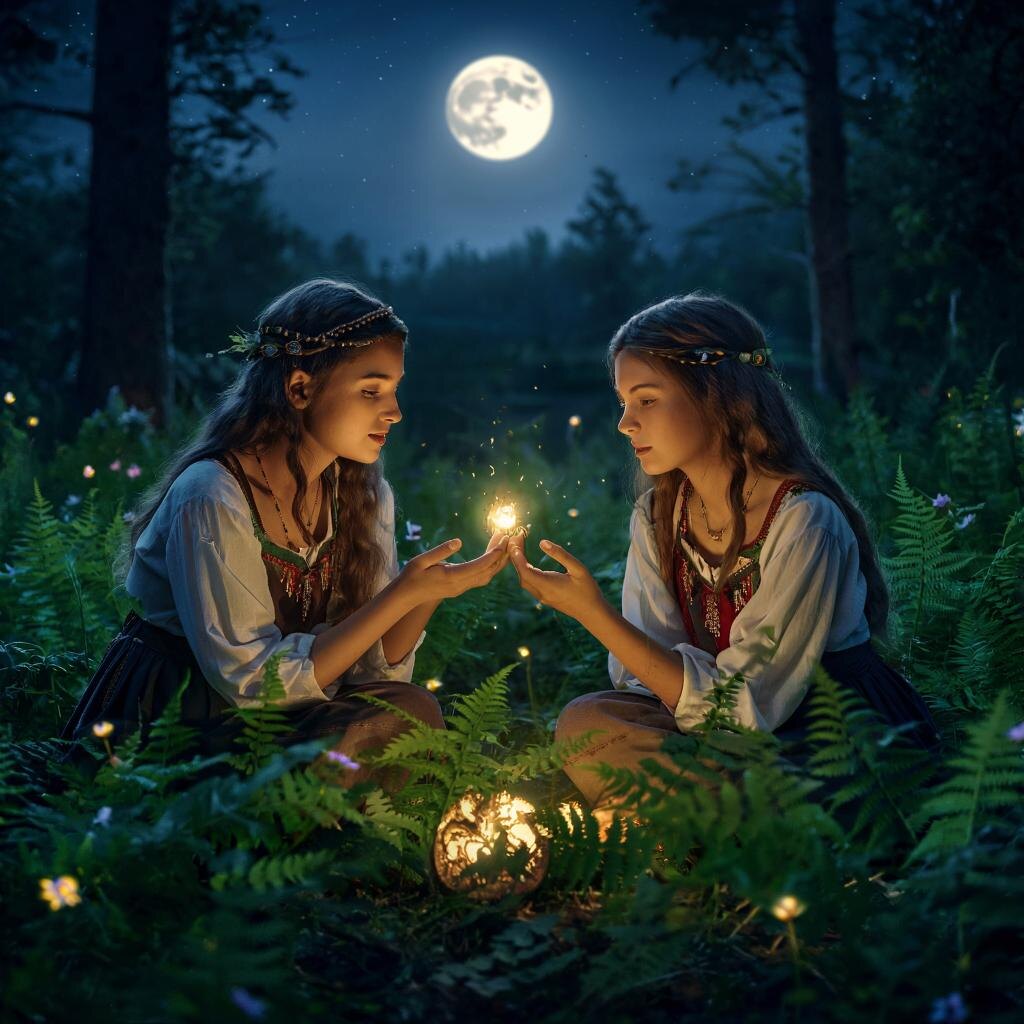 Наступила та самая волшебная купальская ночь — пора загадочных огней, таинственных песен и древних гаданий. Под звёздным небом кружились хороводы вокруг костров, языки пламени озаряли лица девушек, раскрасневшиеся от танцев и нетерпеливого ожидания чуда. Над лесом стелился лёгкий туман, который словно скрывал следы мифического цветка папоротника. Все знали сказание: для кого он зацветёт в эту самую магическую ночь, тот обретёт счастье, богатство и любовь. Но найти цветок было непросто — лишь смелые сердца могли рискнуть отправиться туда, где древний лес хранит свои тайны. Девушки собрались у берега реки, сплетая венки из полевых цветов и травы, украшая их лентами ярких оттенков. Их взгляды были задумчивы и исполнены надежды — ведь сегодня каждый мечтал узнать свою судьбу, встретить своего единственного. — Вон плывут наши веночки! Смотрите, чей быстрее доплывёт до середины! Под звон колокольчиков и задорные песни девушки отпускали венки в плаванье по тихим водам реки. Одни венки весело