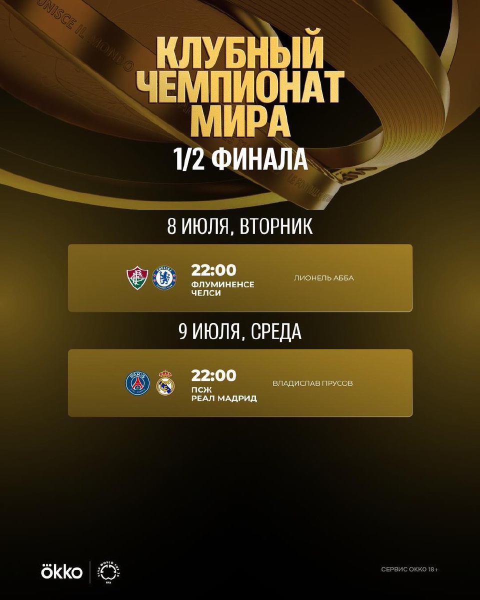 Осталось всего 4 клуба на КЧМ. Финал слишком близко 🫨 Уже завтра «Флуминенсе» попытается сотворить очередную сенсацию на турнире, а в среду нас ждет матч-триллер — «Реал» сыграет против «ПСЖ». ⚡️ Покажем эксклюзивно в Okko: https://okko.tv/s/rb1