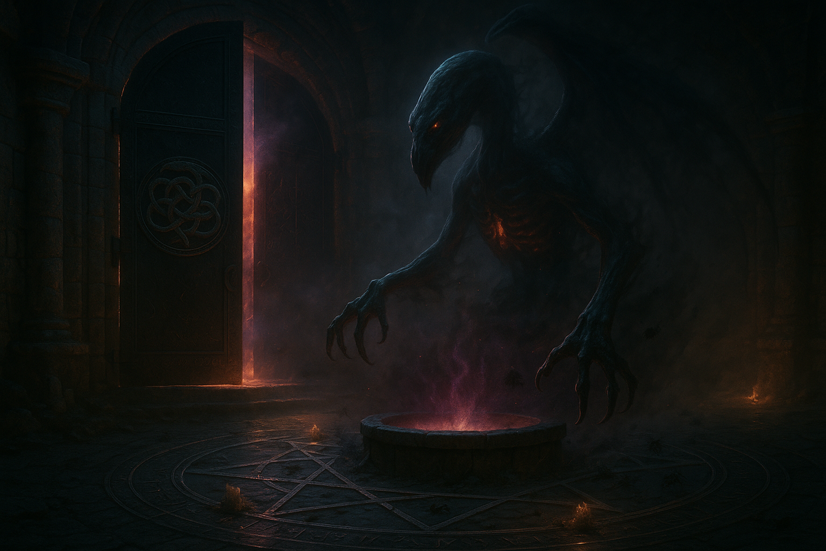 За дверями лежал круглый зал, стены которого терялись во мраке. На полу была выгравирована пентаграмма диаметром в десяток шагов – линии её инкрустированы были потемневшим серебром. По краям всё ещё стояли оплавленные обломки свечей. В центре круга виднелось углубление – чашеобразный колодец диаметром примерно локоть. Из него тянулся слабый пурпурный свет – пульсирующий, словно дыхание спящего зверя.