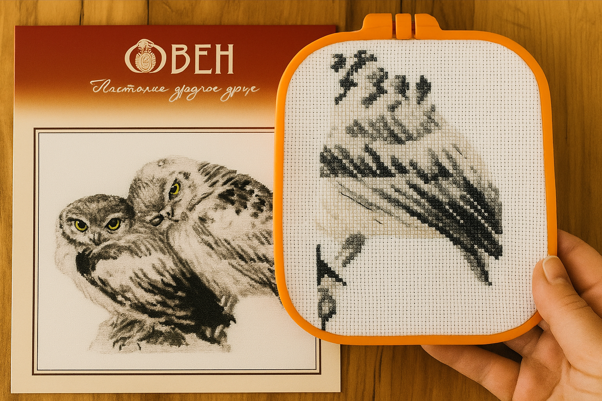 Друзья, хочу поделиться с вами новостями по моим влюблённым совушкам от Овен. Вы уже знаете этот процесс — я показывала его раньше, и вот теперь есть немного продвижения 🙂 На сегодня у меня готово 22%. Вышивка идёт довольно легко и приятно. Очень тёплый, уютный сюжет, прямо как для души. Единственное, что немного мешает — это участки, где нужно вышивать белым по белому. Из-за этого не всегда видно отверстия на канве, особенно вечером. Поэтому такие места стараюсь вышивать днём, при хорошем освещении. Что особенно радует: Бэкстич я вышиваю сразу, по мере продвижения. И, удивительно, он мне тут даже нравится! Не раздражает, наоборот — делает совушек выразительными. Сразу проявляется настроение, появляется мимика, оживает взгляд. Такое ощущение, что с каждым стежком они становятся всё теплее и ближе. Иногда беру в руки и другие процессы, чтобы немного переключиться. Но к совушкам возвращаюсь с особым теплом. Этот набор для меня — про нежность, про любовь, про доброту. Очень «мой» сюжет