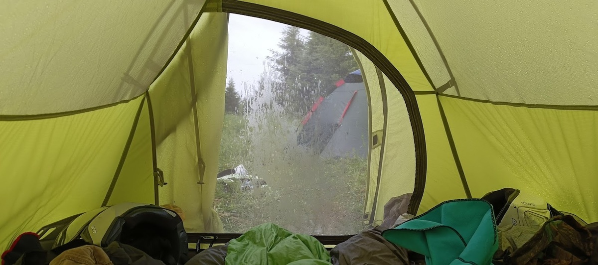 Проснулась от перестука капель дождя по палатке. Очень хорошо что перед сном мы убрали стулья и кухню под корабль, плохо что поленились натянуть тент.