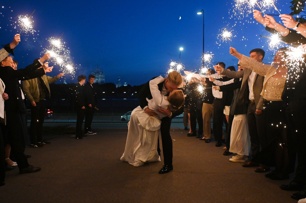 Я выступал в роли репортера на свадьбе, но все же такие мероприятия изначально делаются во многом для того, чтобы это было зафиксировано на фото и видео. С этой точки зрения, это достаточно близко к работе пресс-службы, если вы понимаете, что я имею в виду. Если организаторы свадьбы готовы спрашивать у вас совета и следовать вашим рекомендациям - это замечательно. Андрей и Алиса советовались со мной по части света и пресс-волла для снимков на память. Но главное, что удалось поставить нам с видеооператором, - это сцена с бенгальскими огнями. Изначально гости просто вышли на улицу и начали зажигать огни. Честно говоря, для меня уже это было очень красиво. Но потом мы выстроили "коридор" из гостей и попросили молодоженов потанцевать. Да, это постановка, но зато кадры бомбические.