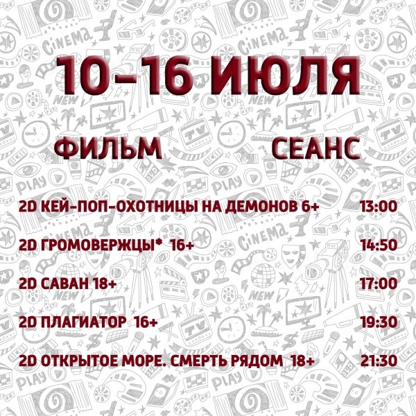 РЕПЕРТУАР НА 10 — 16 ИЮЛЯ На фильмы «Кей-поп-охотницы на демонов» и «Громовержцы*» брони нет. Билет без указания места. https://premierzal.ru/theatre/yashma/schedule Телефон для бронирования: 8 965 941 58 49 Бронь автоматически снимается за 20 минут до начала сеанса Касса кинотеатра открывается за 20 минут до начала первого сеанса и закрывается через 20 минут после начала последнего сеанса Источник https://uchaly102.ru/?p=91018