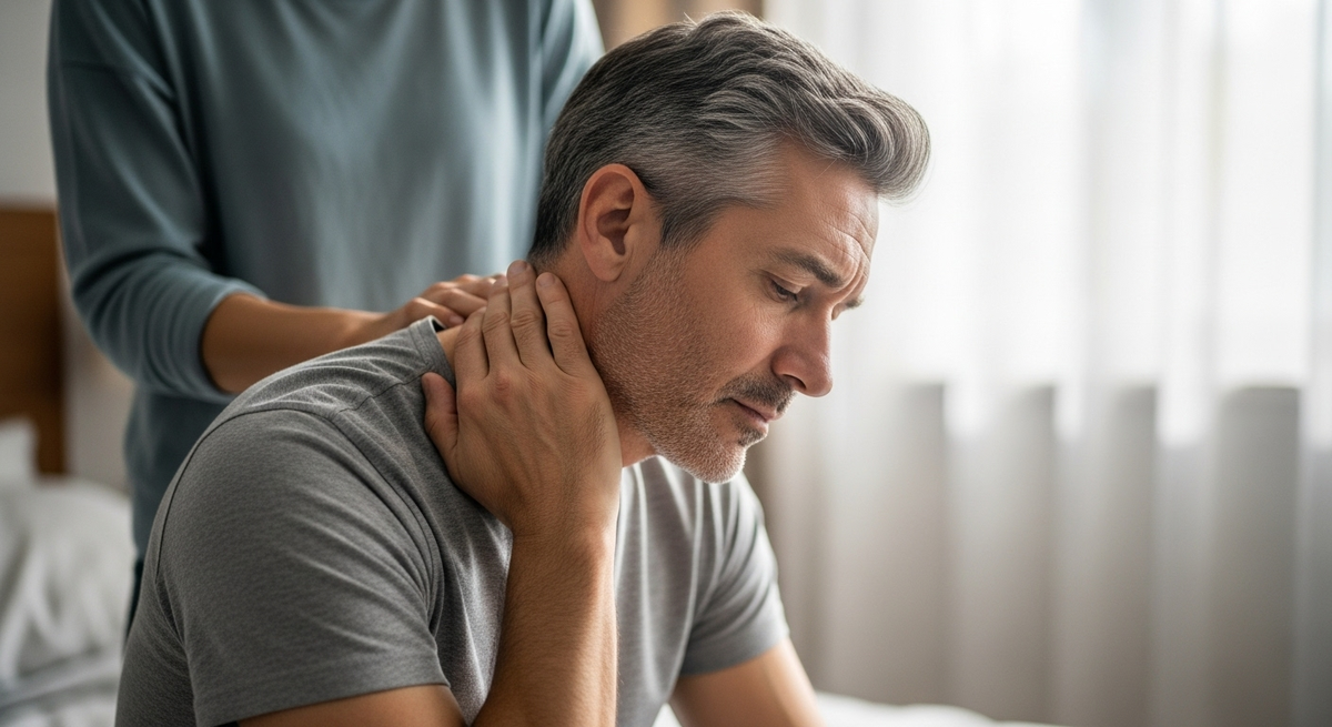 Добрый вечер, дорогие друзья! Сегодня мы поговорим о головных болях, головокружениях, ухудшении зрения и даже о такой неприятности, как «поехавшая» вперёд шея. Все эти проблемы могут быть связаны с одной очень важной мышцей. Давайте для наглядности представим двух людей. Первый — со здоровой, симметричной шеей. А вот у второго есть проблемы: одна сторона мышц слабая и растянутая, а другая, наоборот, укорочена и напряжена. Такое положение шеи неизбежно ведёт к проблемам со здоровьем, и сегодня я покажу вам, как это исправить. Речь пойдёт о грудино-ключично-сосцевидной мышце (ГКСМ). Это та самая мышца, которая видна на шее при повороте головы. Её главная функция — поворачивать и наклонять голову. Но самое интересное, что она напрямую влияет на кровоснабжение нашего мозга, а также на зрение и слух. Если эта мышца слабеет или спазмируется с одной стороны, то меняется положение головы. Челюсть перекашивается, меняется прикус, а за этим следуют головные боли, проблемы со зрением и слухом. Чт